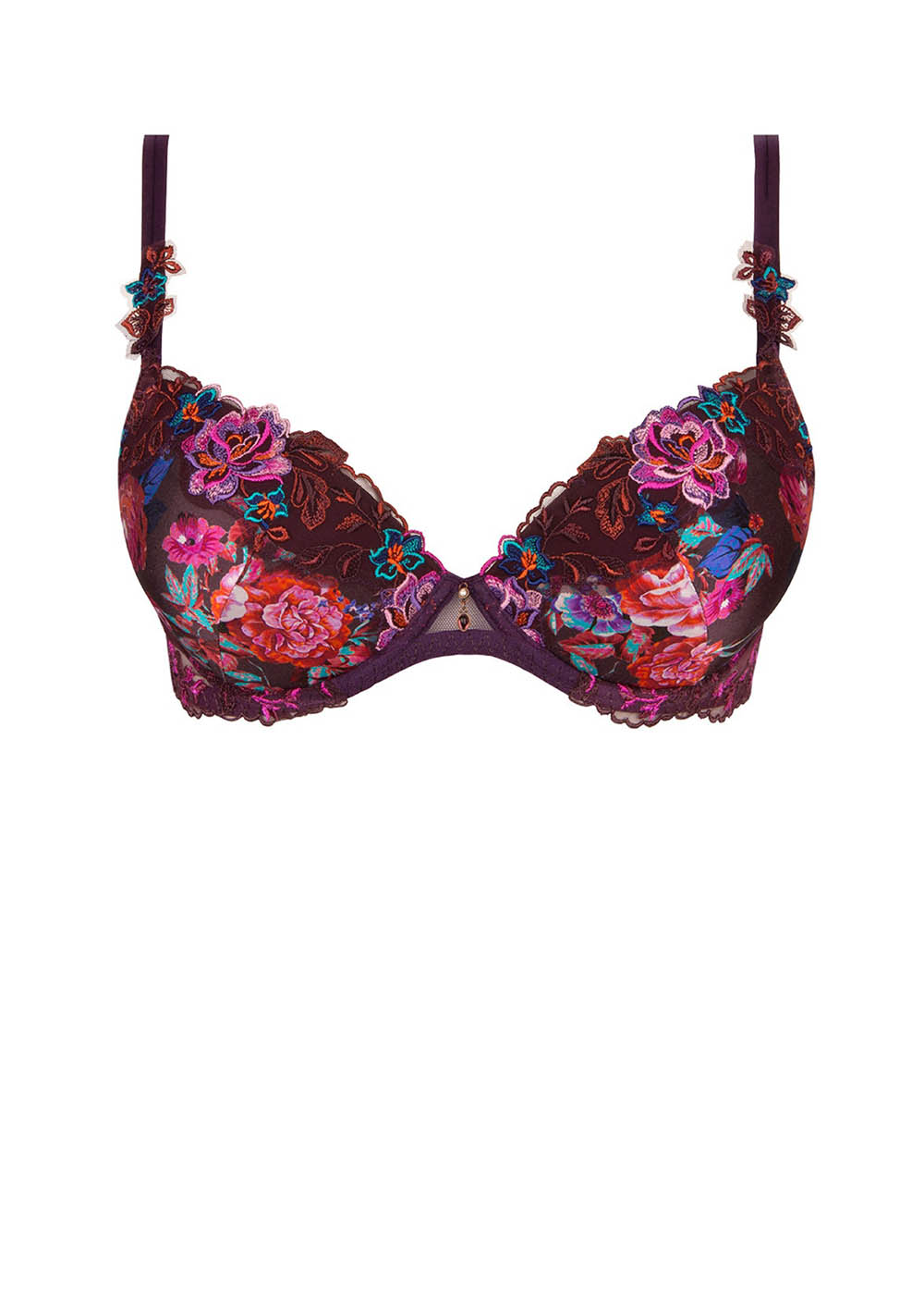 Soutien-gorge coqué à armatures. Poitrine galbée et arrondie. Bonnets en soie imprimée et broderie multicolore. Basque festonnée avec soie imprimée au dos. Bretelles spaghettis avec motifs brodés. Bijou perle à l'entre-seins. 37% polyuréthane, 34% polyester, 13% soie, 12% polyamide, 3% élasthanne, 1% coton.
