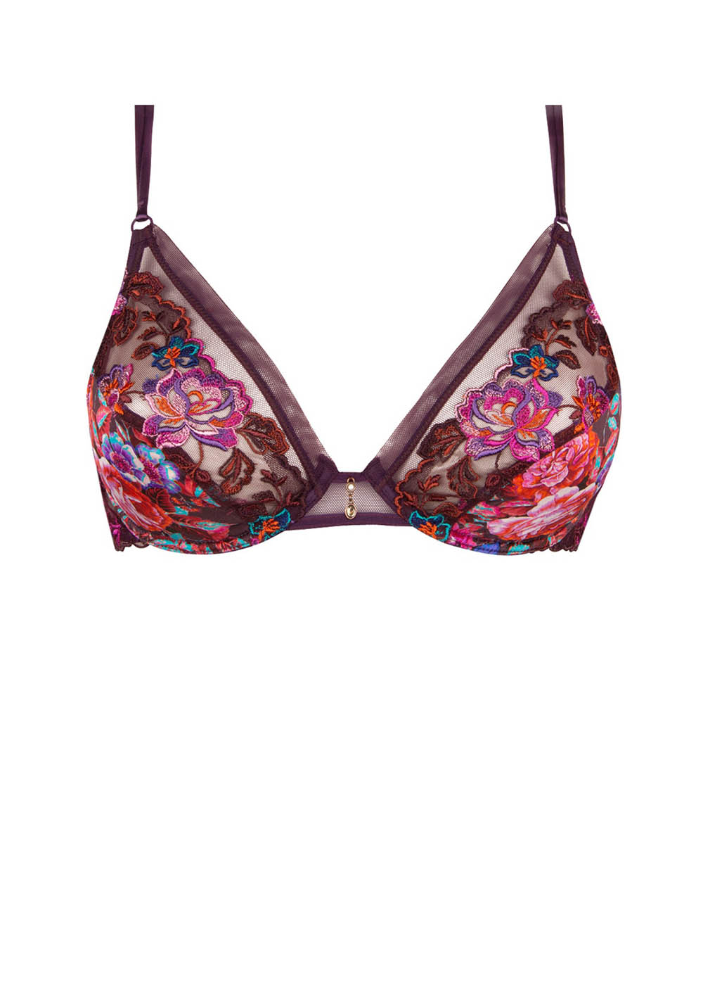 Soutien-gorge à armatures, bonnets triangles. Décolleté plongeant en toute légèreté. Bonnets en soie imprimée et broderie multicolore. Décolleté souligné par du tulle. Dos festonné avec soie imprimée au dos. Bretelles spaghettis. Bijou perle à l'entre-seins. 36% polyester, 33% polyamide, 18% soie, 9% élasthanne, 4% coton.