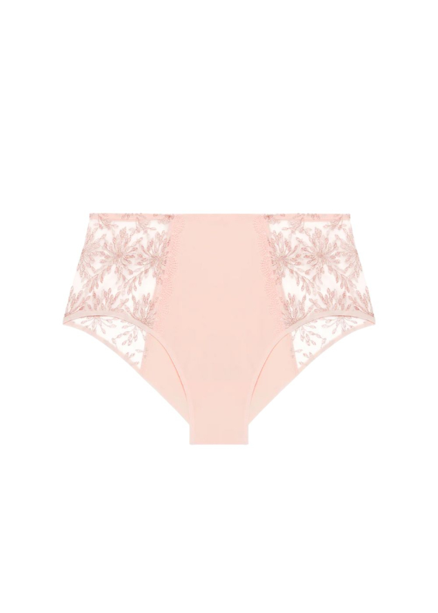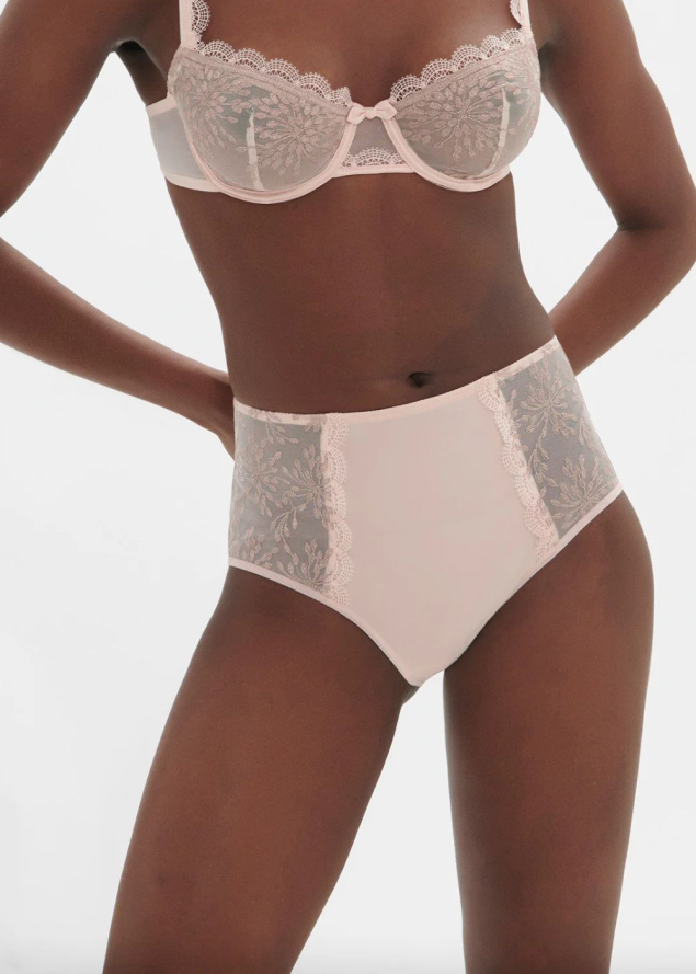 Devant en maille opaque et broderie sur les côtés, souligné de galons de guipure.
